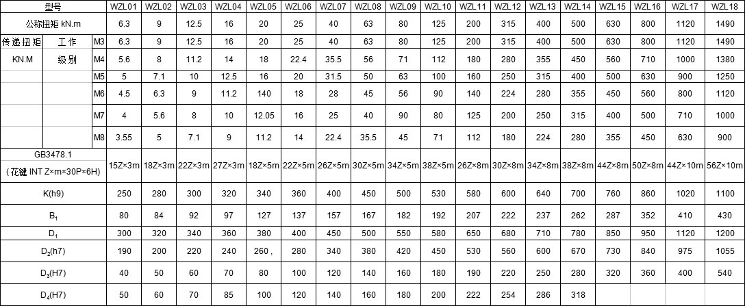 WZL內(nèi)花鍵卷筒聯(lián)軸器主要參數(shù)及尺寸: mm