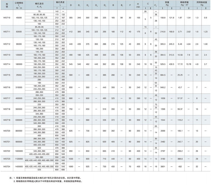 WGT型--接中間套型,適用于兩軸長(zhǎng)距離聯(lián)接,許用轉(zhuǎn)速[n]取決于中間套的長(zhǎng)度和質(zhì)量,并應(yīng)驗(yàn)算臨界轉(zhuǎn)速;